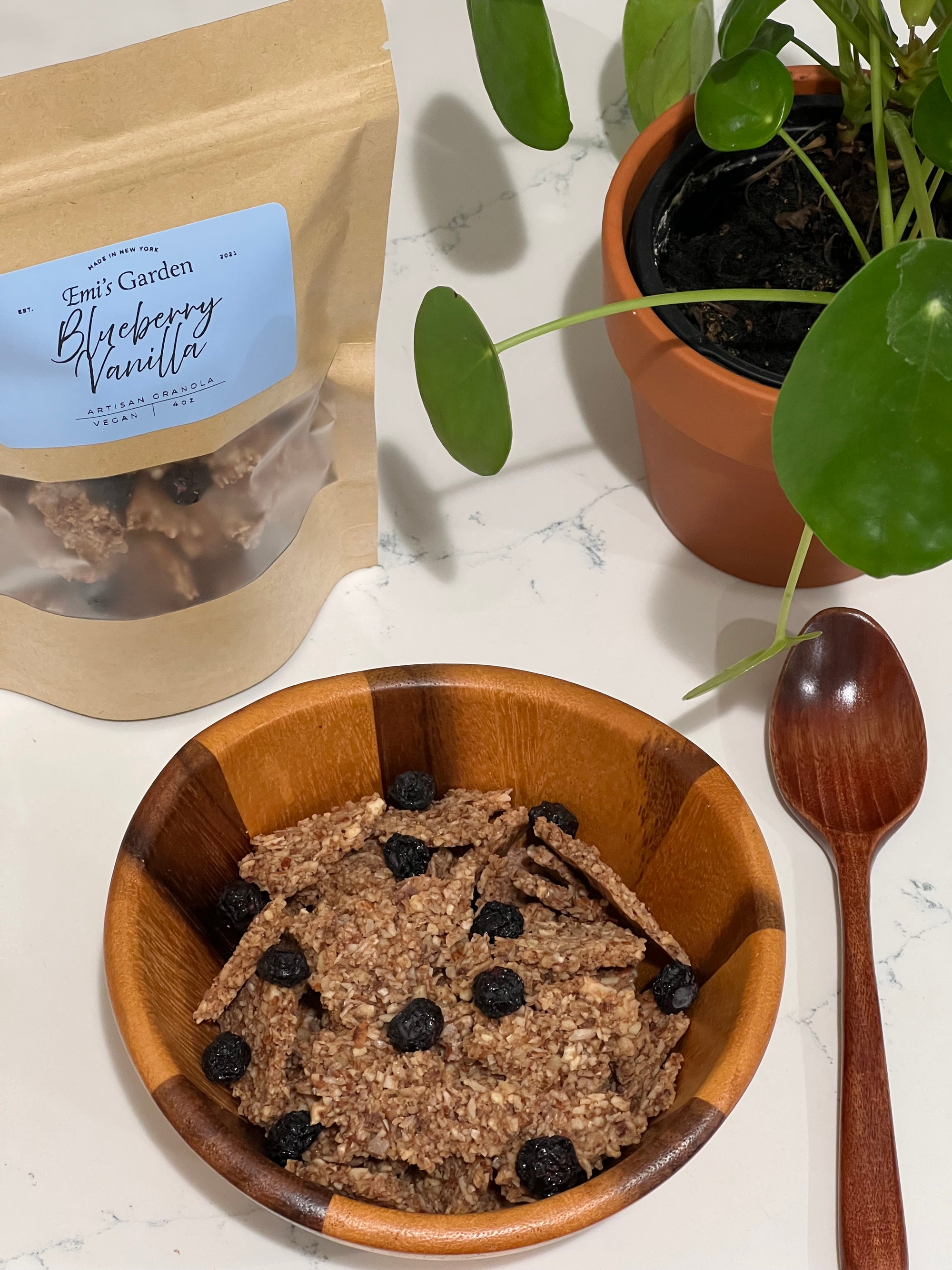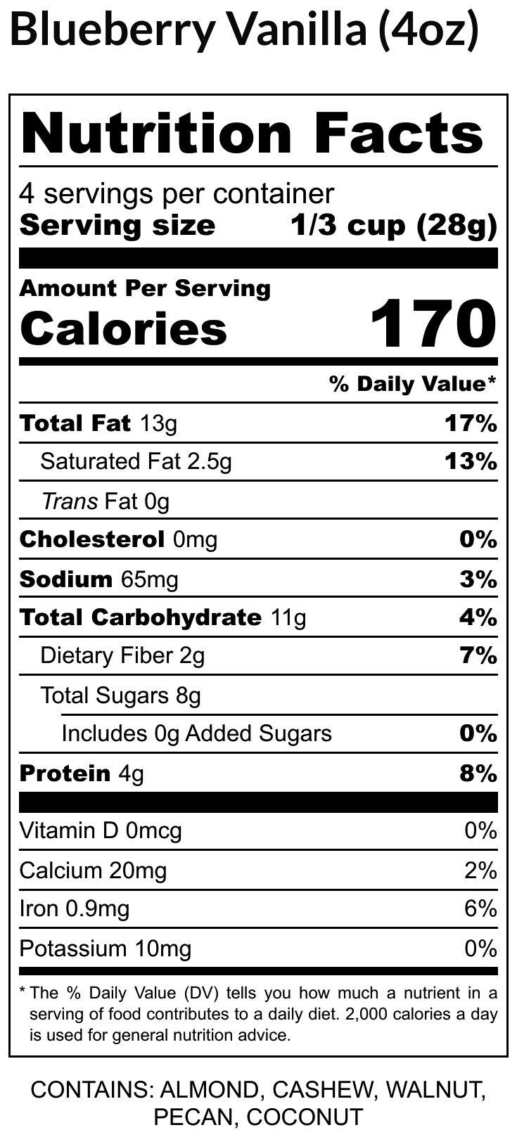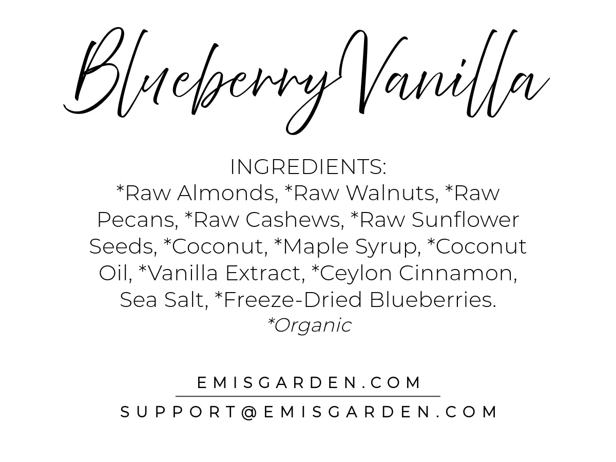 Ingredients: *Raw Almonds, *Raw Walnuts, *Raw Pecans, *Raw Cashews, *Raw Sunflower Seeds, *Coconut, *Maple Syrup, *Coconut Oil, *Vanilla Extract, *Ceylon Cinnamon, Sea Salt, *Freeze-Dried Blueberries