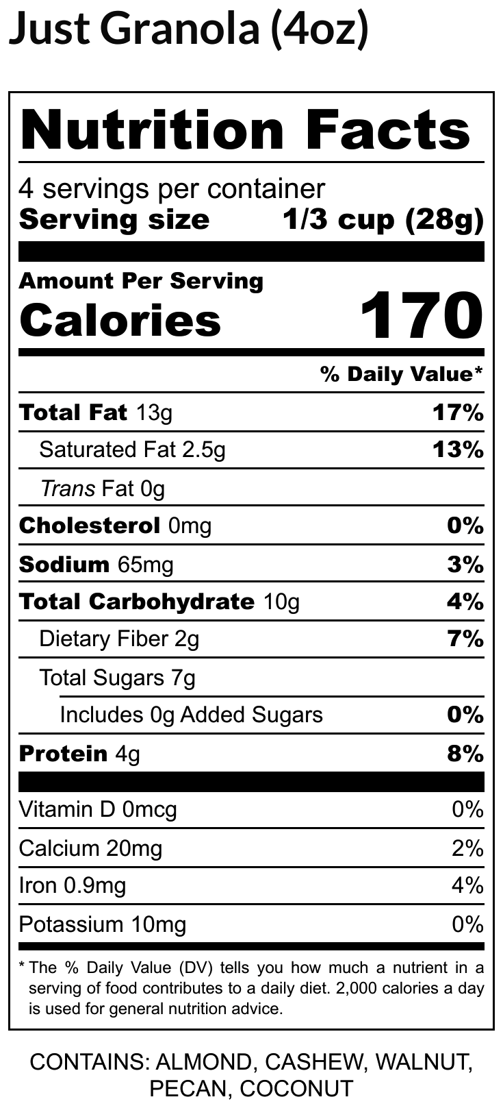 Ingredients: *Raw Almonds, *Raw Walnuts, *Raw Pecans, *Raw Cashews, *Raw Sunflower Seeds, *Coconut, *Maple Syrup, *Coconut Oil, *Vanilla Extract, *Ceylon Cinnamon, Sea Salt