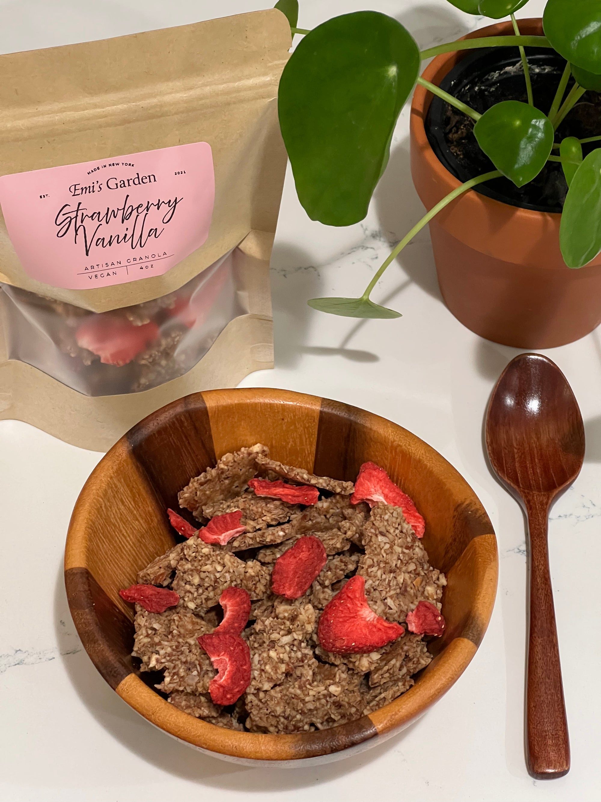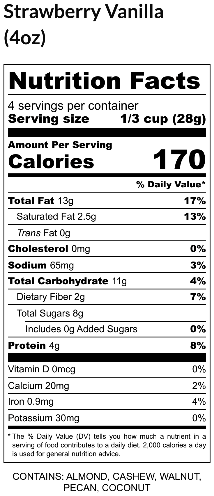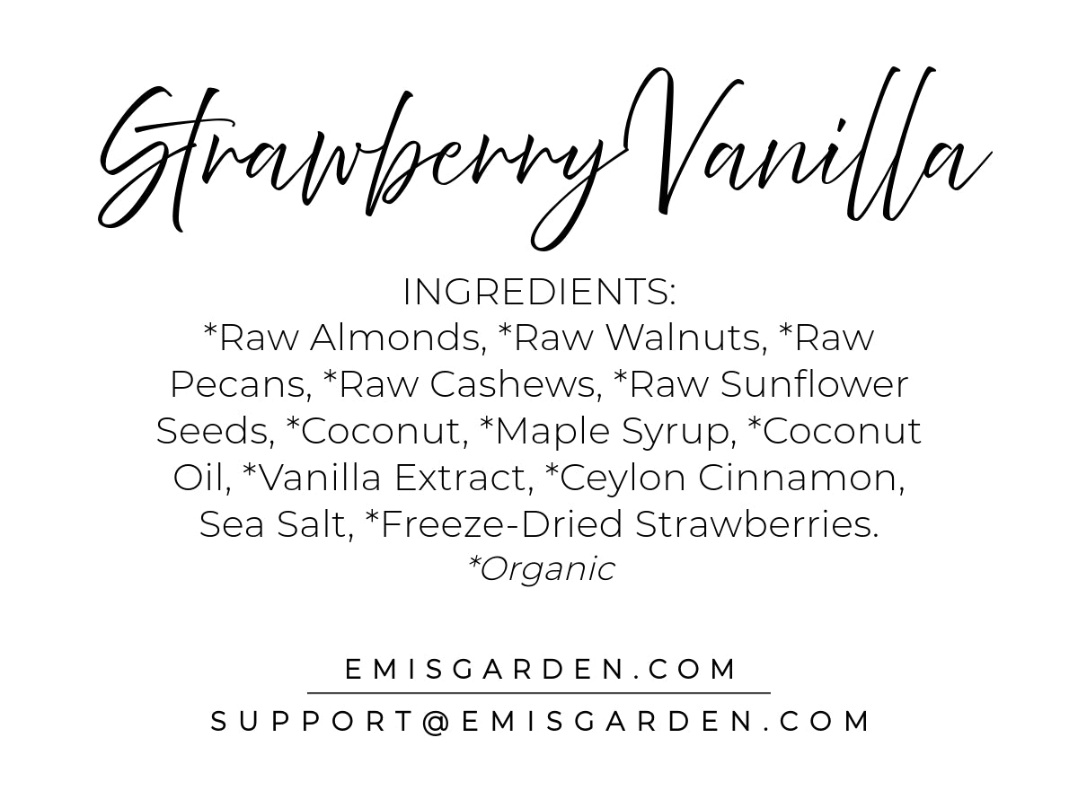 Ingredients: *Raw Almonds, *Raw Walnuts, *Raw Pecans, *Raw Cashews, *Raw Sunflower Seeds, *Coconut, *Maple Syrup, *Coconut Oil, *Vanilla Extract, *Ceylon Cinnamon, Sea Salt, *Freeze-Dried Strawberries.