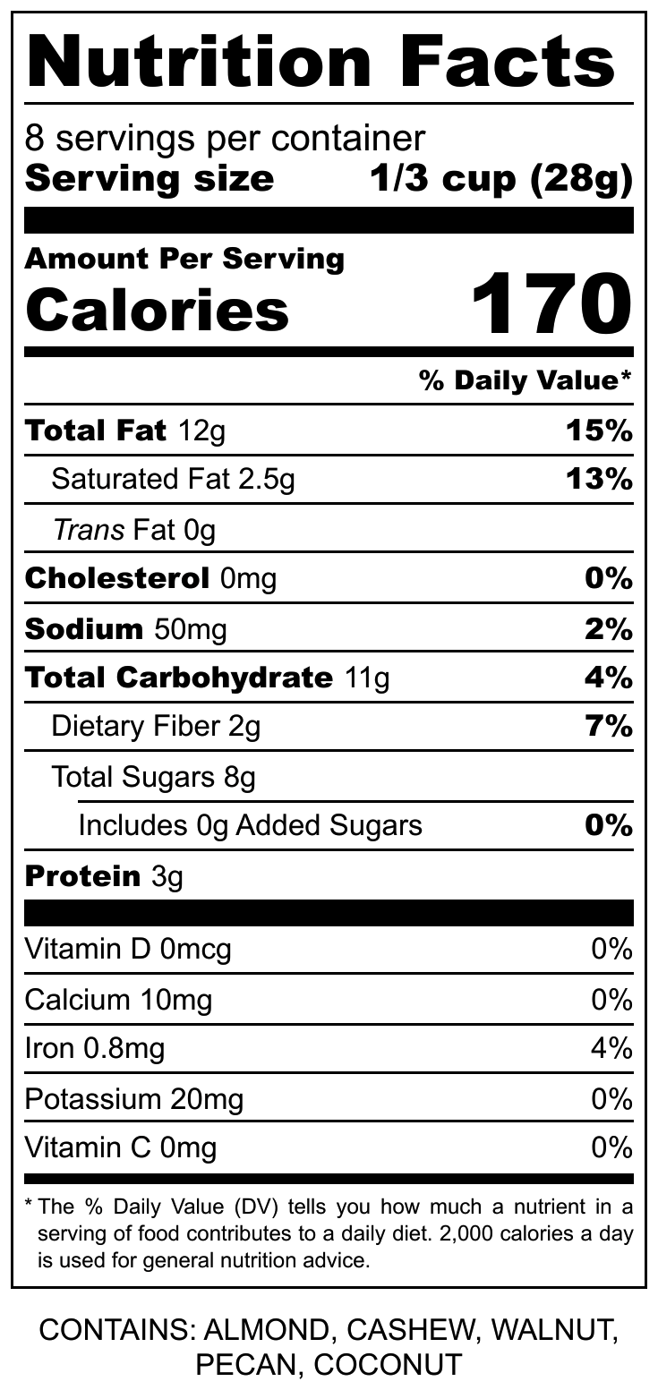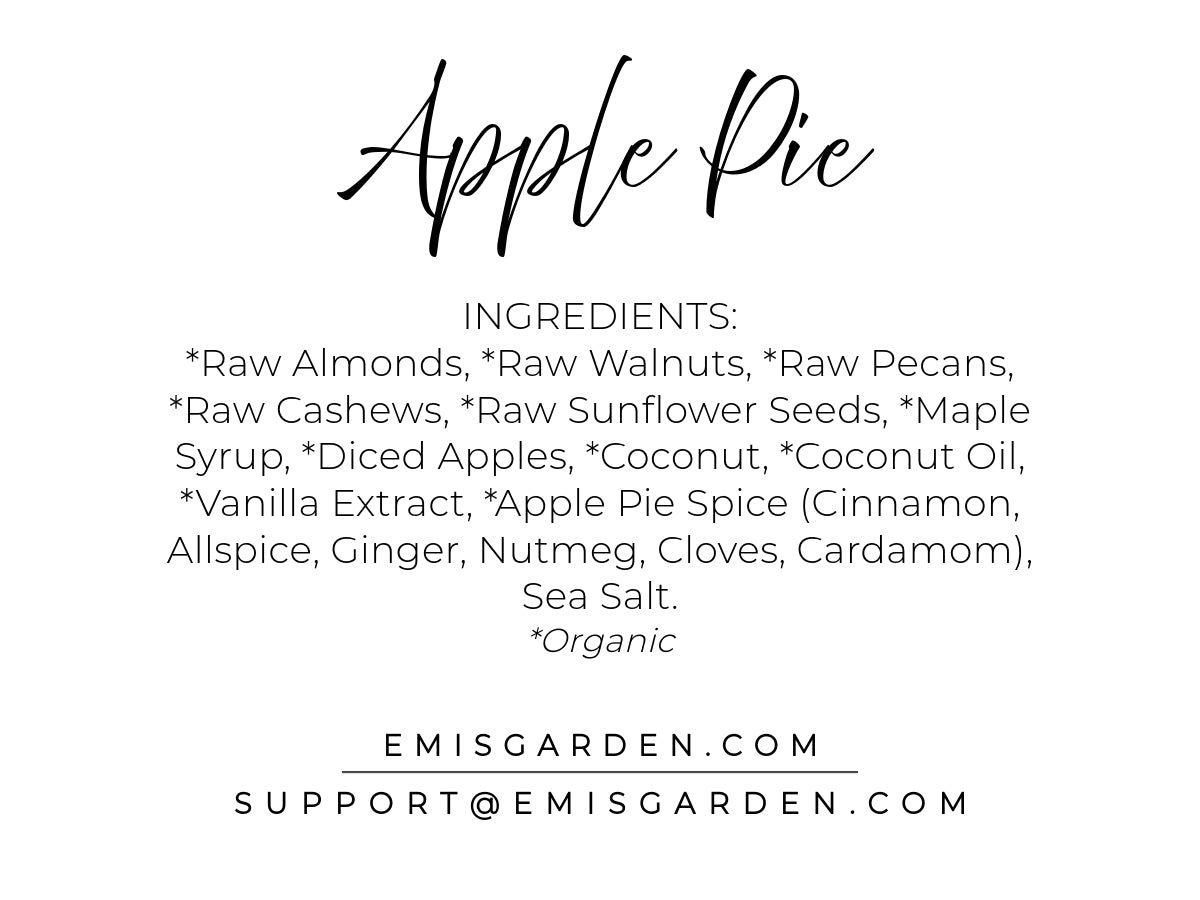 *Raw Almonds, *Raw Walnuts, *Raw Pecans, *Raw Cashews, *Raw Sunflower Seeds, *Maple Syrup, *Diced Apples, *Coconut, *Coconut Oil, *Vanilla Extract, *Apple Pie Spice (Cinnamon, Allspice, Ginger, Nutmeg, Cloves, Cardamom), Sea Salt.
