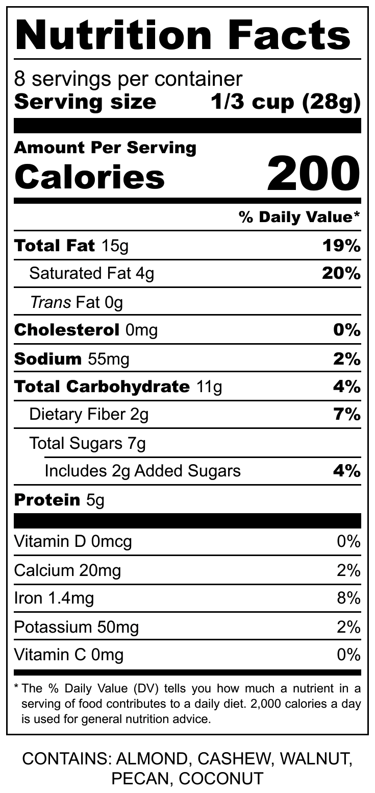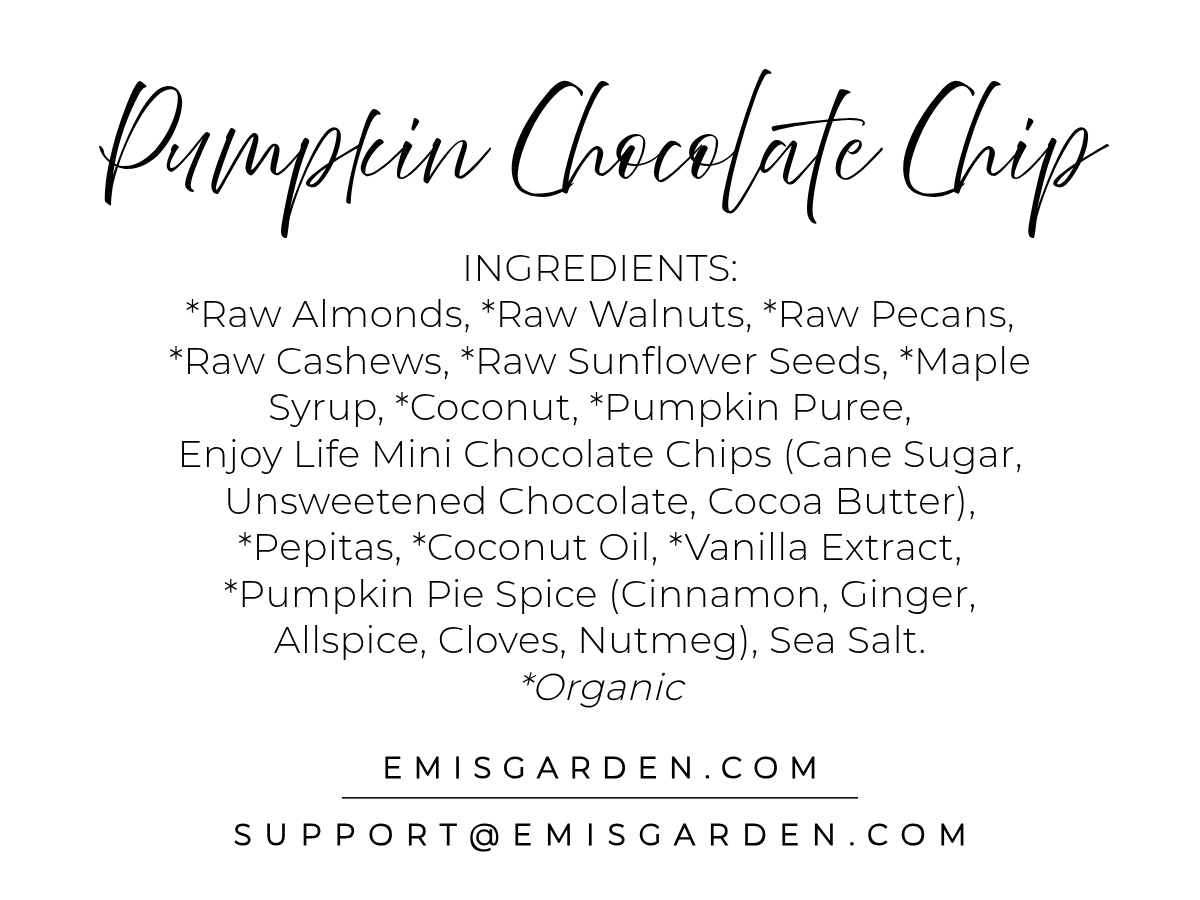 *Raw Almonds, *Raw Walnuts, *Raw Pecans, *Raw Cashews, *Raw Sunflower Seeds, *Maple Syrup, *Coconut, *Pepitas, *Pumpkin Puree, Enjoy Life Mini Semi-Sweet Chocolate Chips (Cane Sugar, Unsweetened Chocolate, Cocoa Butter), *Coconut Oil, *Vanilla Extract, *Pumpkin Pie Spice (Cinnamon, Ginger, Allspice, Cloves, Nutmeg), Sea Salt